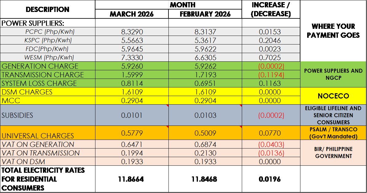 NOCECO informs its member-consumer-owners of a slight adjustment in electricity rates this month. The total residential rate for March 2026 is Php 11.8664 per kWh, representing a minimal increase of Php 0.0196 from February. While we successfully offset a significant Php 0.7025/kWh spike in WESM prices through lower transmission costs and reduced VAT, we are closely monitoring the escalating conflict in the Middle East. President Marcos has recently issued Executive Order No. 110, declaring a State of National Energy Emergency as global oil prices surge toward $120 per barrel. Because the Philippines relies heavily on imported fuel, these geopolitical tensions are expected to put significant upward pressure on the Generation Charge in your April billing, with industry experts warning of potential increases.