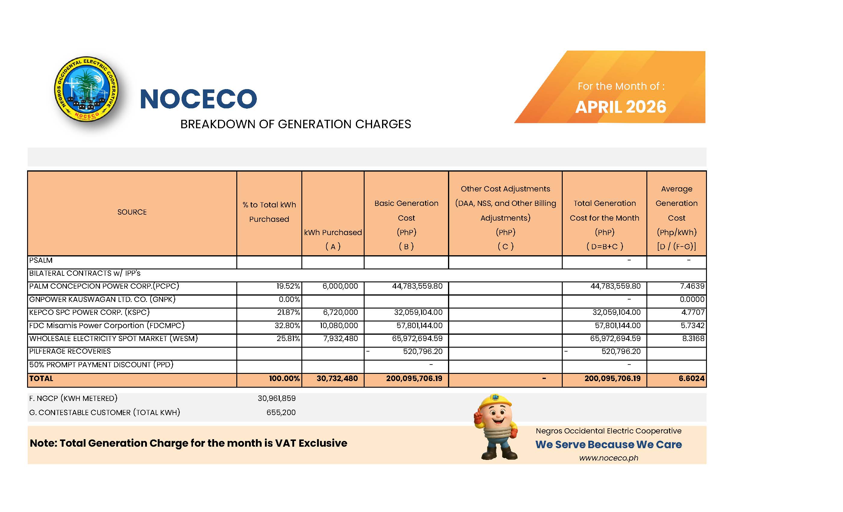 Generation Charge is the charge of the production of electricity. NOCECO's Breakdown is listed here