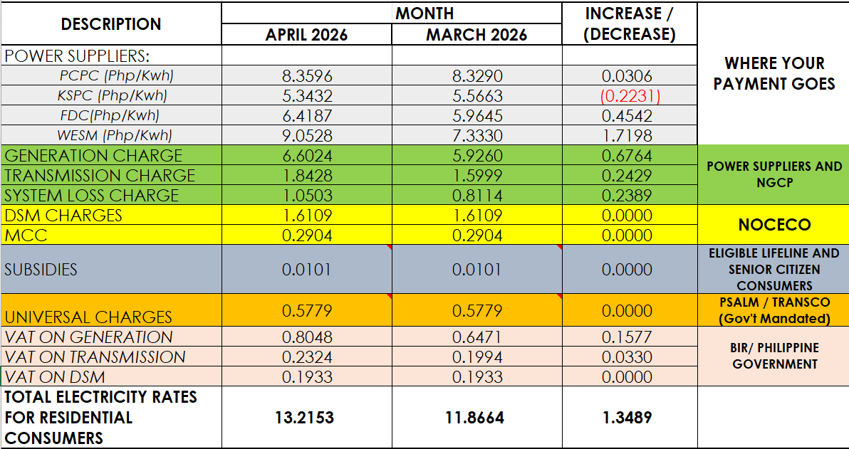 NOCECO announces that residential electricity rates for April 2026 have increased to Php 13.2153 per kWh, an increase of Php 1.3489 from the previous month. This adjustment is primarily driven by a sharp rise on the cost of power purchased from the spot market, which surged by Php 1.7198 per kWh, pushing the overall generation charge to increase by Php .6764 per kWh as compared to last month. Additional increases were also recorded in Transmission Charges due to high Ancillary charges. Systems loss charge also increased by Php 0.2389 per kWh.